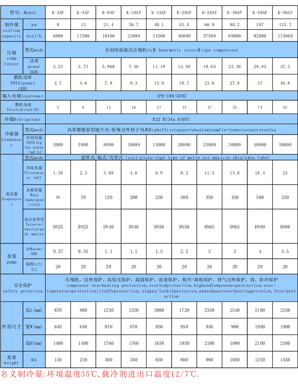 8.水冷及風(fēng)冷式規(guī)格齊全(功率:3HP-300HP,制冷量從600W至34800W)專門設(shè)有適合各行業(yè)機(jī)械設(shè)備配套之機(jī)型,可按客戶要求特別制造。