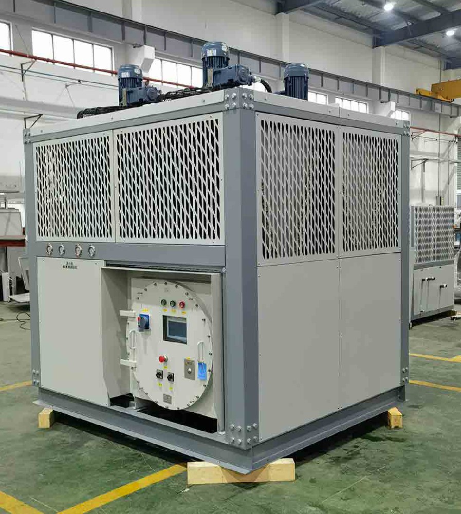 化工防爆制冷機組是在標準型制冷機組的基礎(chǔ)上,為防止電氣設(shè)備引起周圍爆炸性氣體環(huán)境引燃而采取的特定的防爆措施,主要應(yīng)用與易燃易爆等特種場所,如:可燃性氣體,粉塵環(huán)境,煉油、化工、石化,加油站、加氣站等,在 爆炸性氣體環(huán)境大氣條件下,氣體、蒸汽或霧狀的可燃物質(zhì)與空氣構(gòu)成的混合物 ,在該混合物中點燃后,燃燒將傳遍整個未燃混合物的環(huán)境。